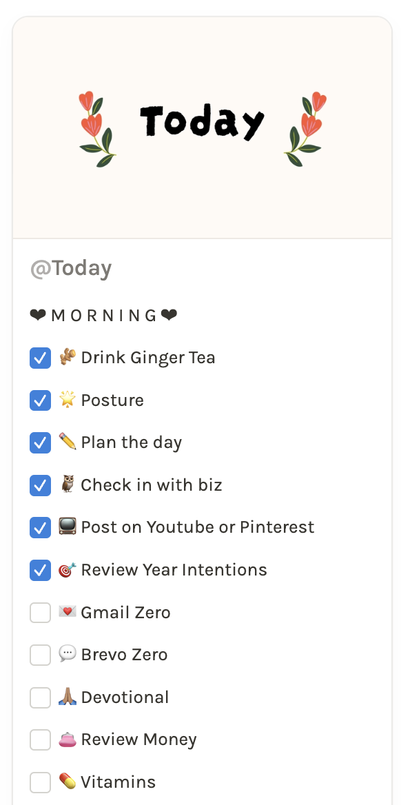 These go into your Daily Rhythm. Each day you check off what gets done — not from a place of forced consistency, but so the system can accumulate data on what's actually happening naturally.