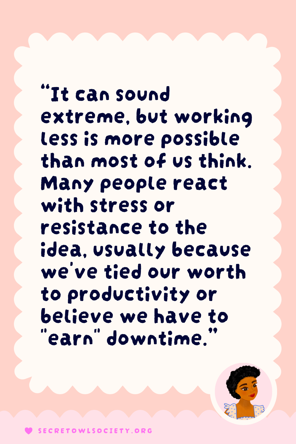 It can sound extreme, but working less is more possible than most of us think. Many people react with stress or resistance to the idea, usually because we've tied our worth to productivity or believe we have to "earn" downtime.